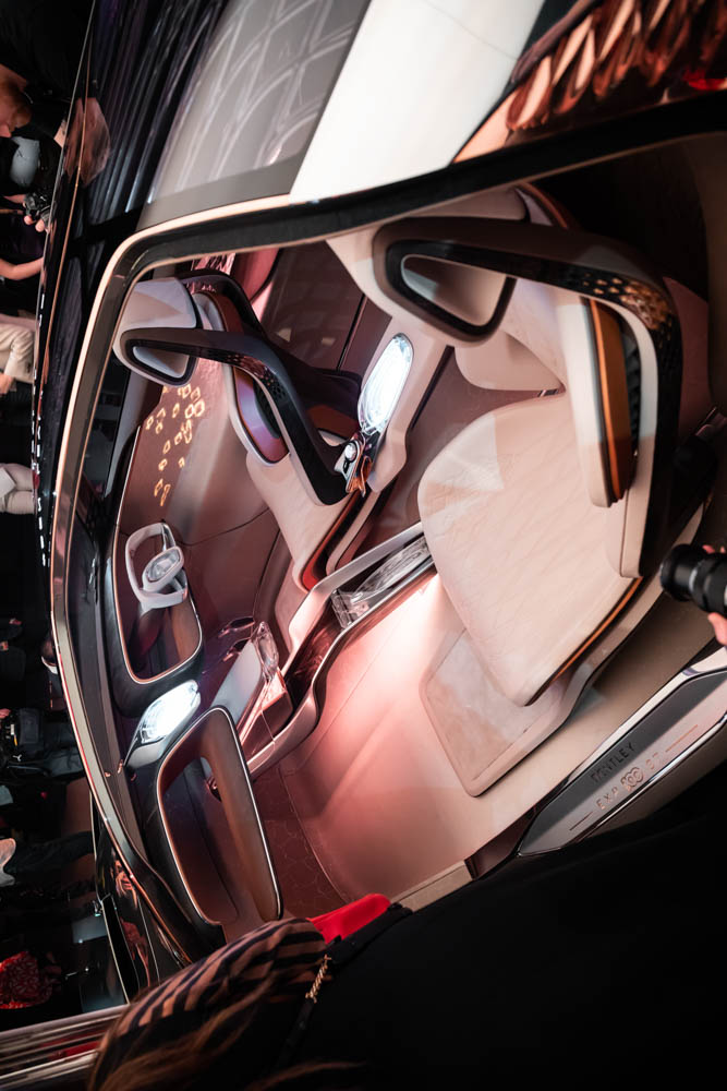 Vnútro je plné materiálov vyrobených z udržateľných zdrojov. Ekológia však pri hedonizme značky ide bokom, keďže sa v kabíne nachádza až 5000 ročné drevo so špeciálnou medenou zmesou. Sedenie je možné upraviť podľa troch scenárov, či už šoférujete, ale sa len vozíte v autonómnom režime.