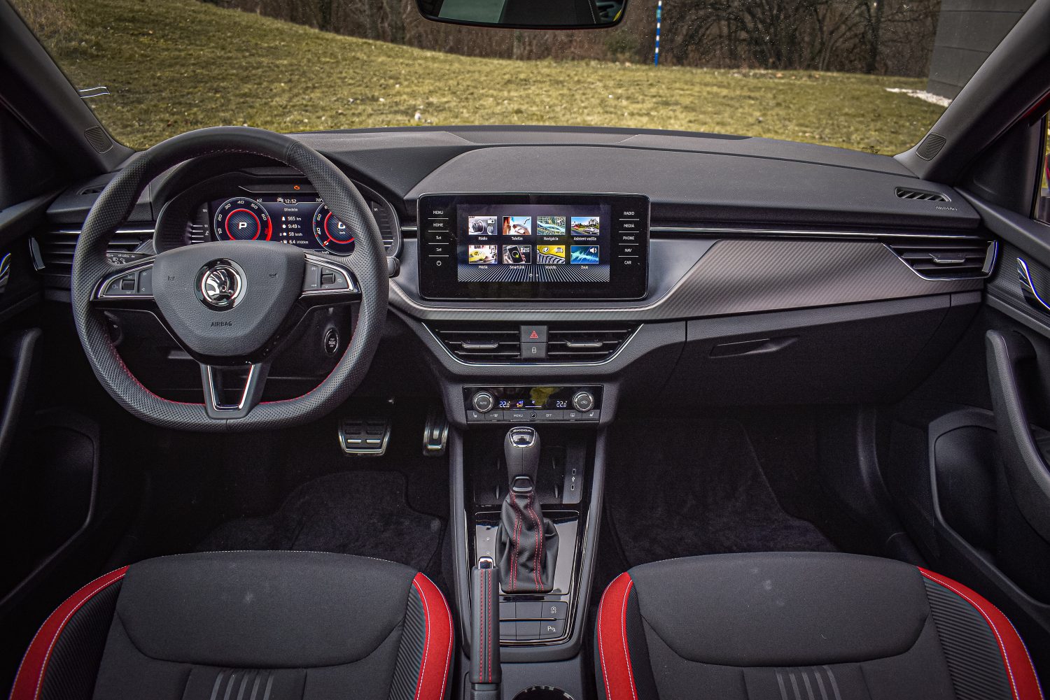 S interiérom sa dizajnéri vyhrali viac. Kým zvonku prevládali čierne prvky, vo vnútri vyniknú červené, samozrejme na tmavom podklade. Športový veniec volantu v tvare písmena D a športové sedadlá vás nenechajú na pochybách, v akej verzii Scaly sedíte. Vypracovanie interiéru hodnotím na výbornú. Podobnú známku si zaslúži aj dizajn niektorých ďalších častí. Vyzdvihol by som kľučky dverí akoby voľne plávajúce v priestore. Celkovo považujem vnútro Scaly za nápadité a posúvajúce značku mimo osvedčených a konzervatívnych postupov.