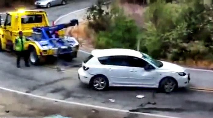 Neuveriteľné, aká smola sa tomuto autu nalepila na päty. Ako sa asi cítila majiteľka bieleho automobilu Mazda3, po tom čo si na mobil nahrávala nezvratný osud svojho nabúraného, na bok vyvaleného automobilu?